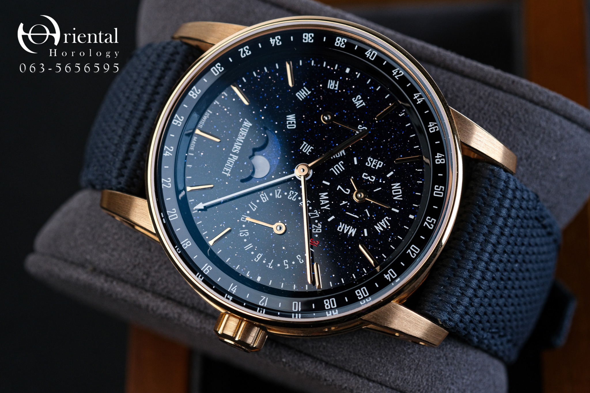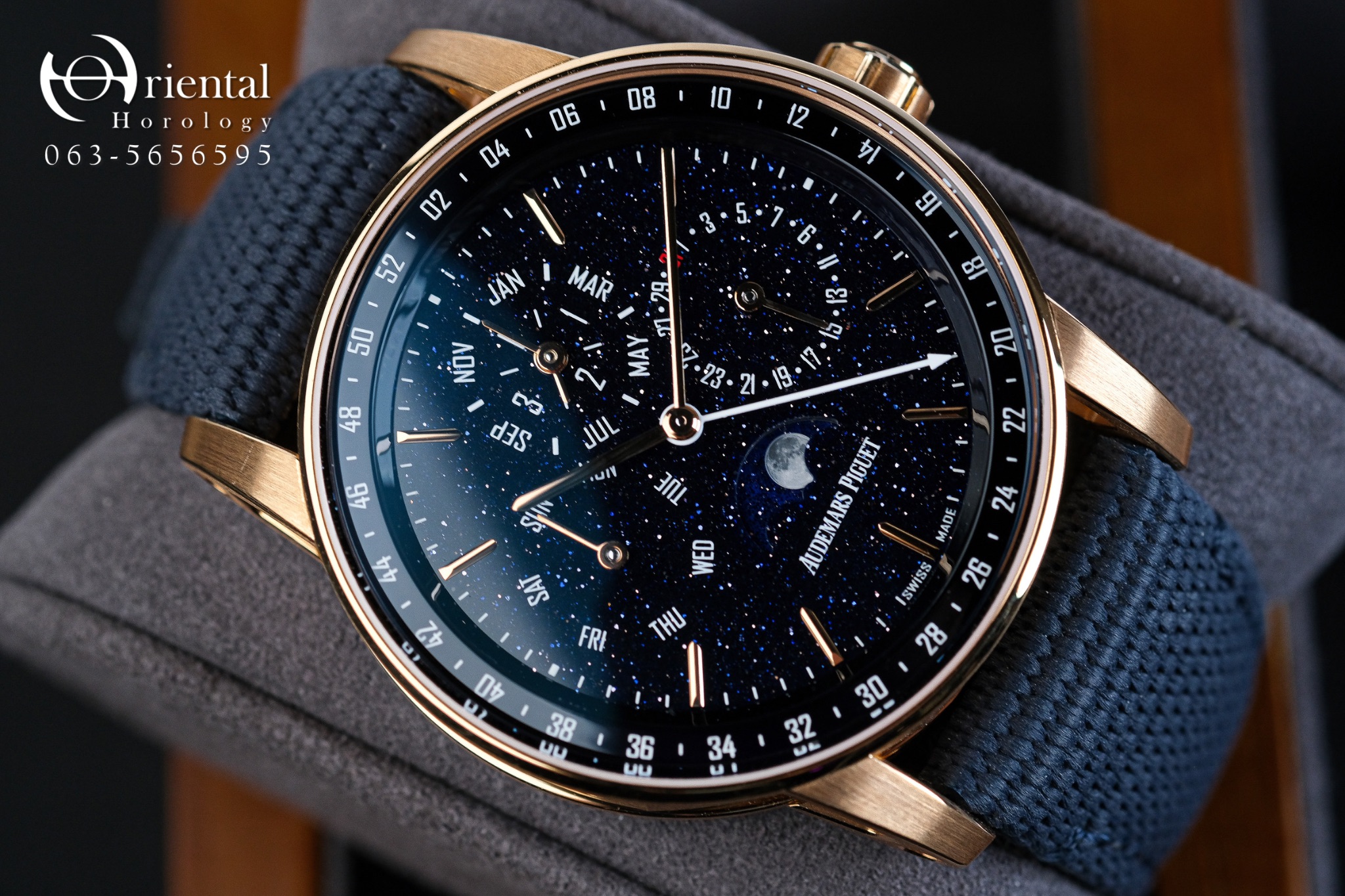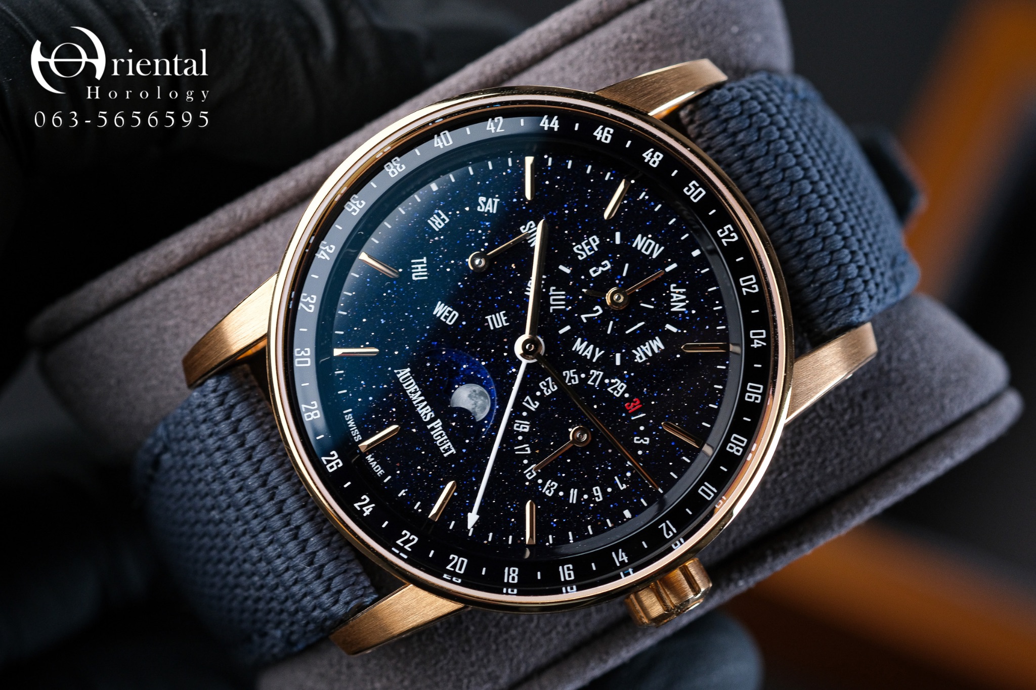 🌟 เรือนเวลาขนาด 41 มม วัสดุ 18K Rose Gold สุดล้ำค่า หน้าปัด Blue Aventurine หรูหรา จำลองท้องฟ้ายามค่ำคืน โดดเด่นด้วยการวางวง Sub-Dial ของฟังก์ชัน Perpetual Calendar และ Moon phase ชุดเข็มและหลักบอกเวลา rose gold ซึ่งตัดกับพื้นหน้าปัดได้อย่างงดงาม อีกทั้งสายนาฬิกา Kevlar น้ำเงินเข้มเพิ่มความดูดีและให้ลุคที่ดูสุขุม กลไก Automatic เปลือยหลังอวดกลไกสวยๆและ Rotor ทองคำ 22K ครับผม