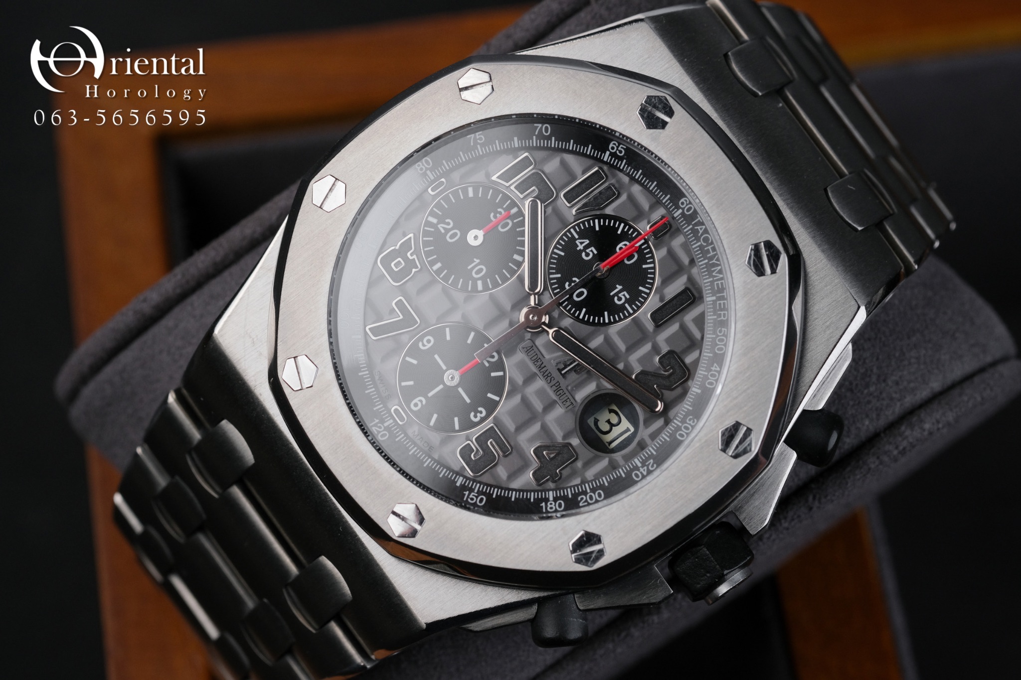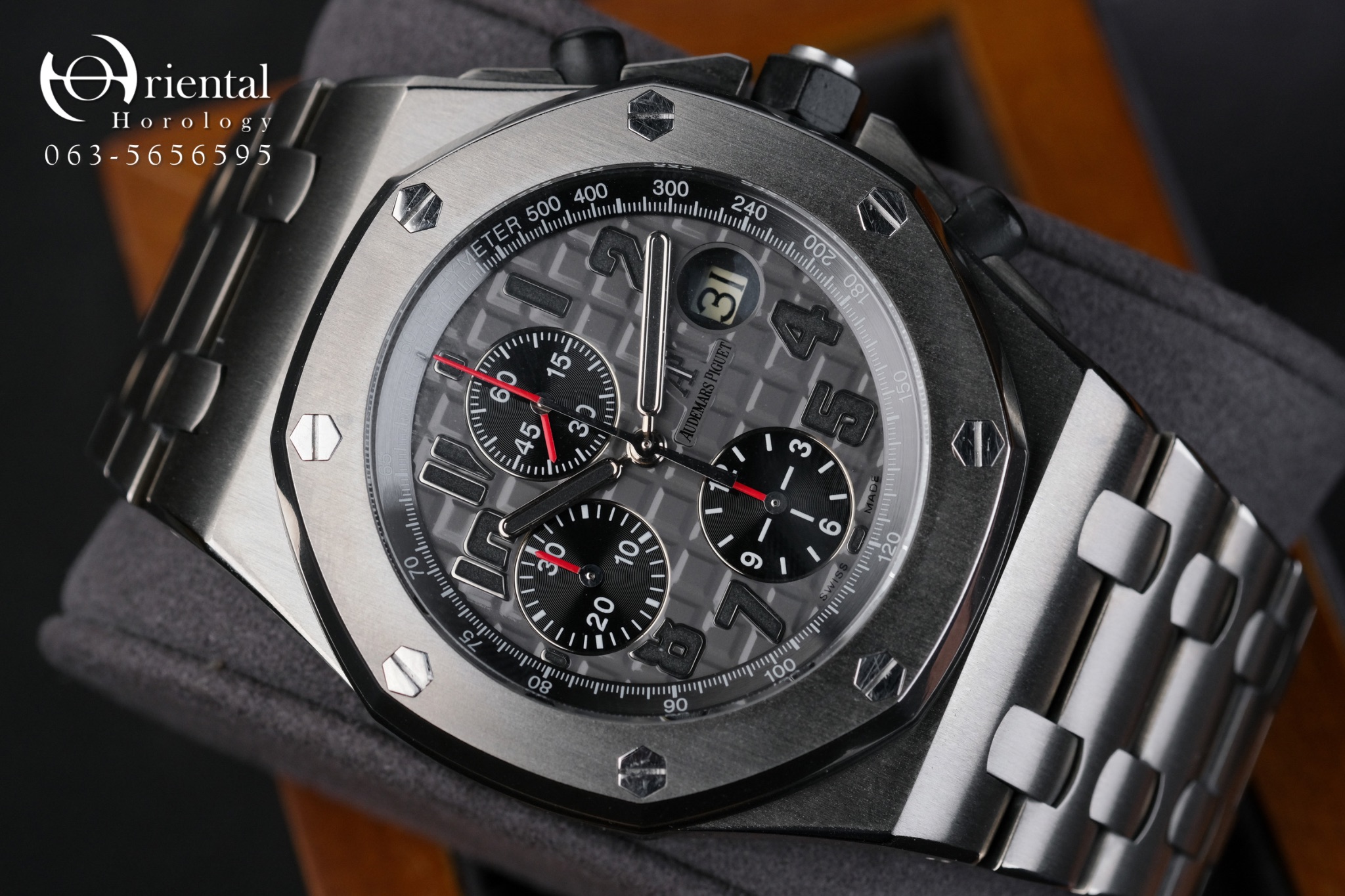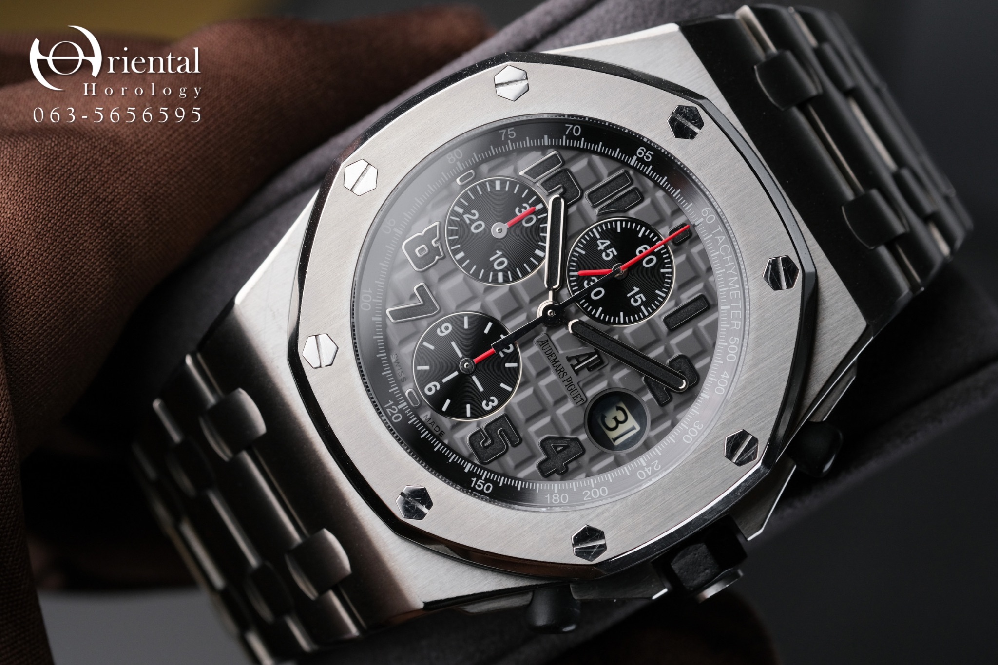 🌟 นาฬิกาทรงสปอร์ตแปดเหลี่ยมยอดนิยมจาก AP ตัวเรือนมาในขนาด 42 มม. วัสดุ Titanium ตัดกับหน้าปัดสีเทาเล่นแสง และวงหน้าปัดย่อยสีดำ คงเอกลักษณ์ด้วยการแกะลายตารางสี่เหลี่ยมตามสไตล์ตระกูล offshore เสริมความสปอร์ตด้วยเม็ดมะยมด้านข้างสีดำ มาพร้อมฟังก์ชัน Chronograph, Date และ Tachymeter สำรองพลังงาน 50 ชั่วโมง กลไก Automatic สวมใส่ง่าย ดูเท่ห์สปอร์ตสุดๆครับผม
