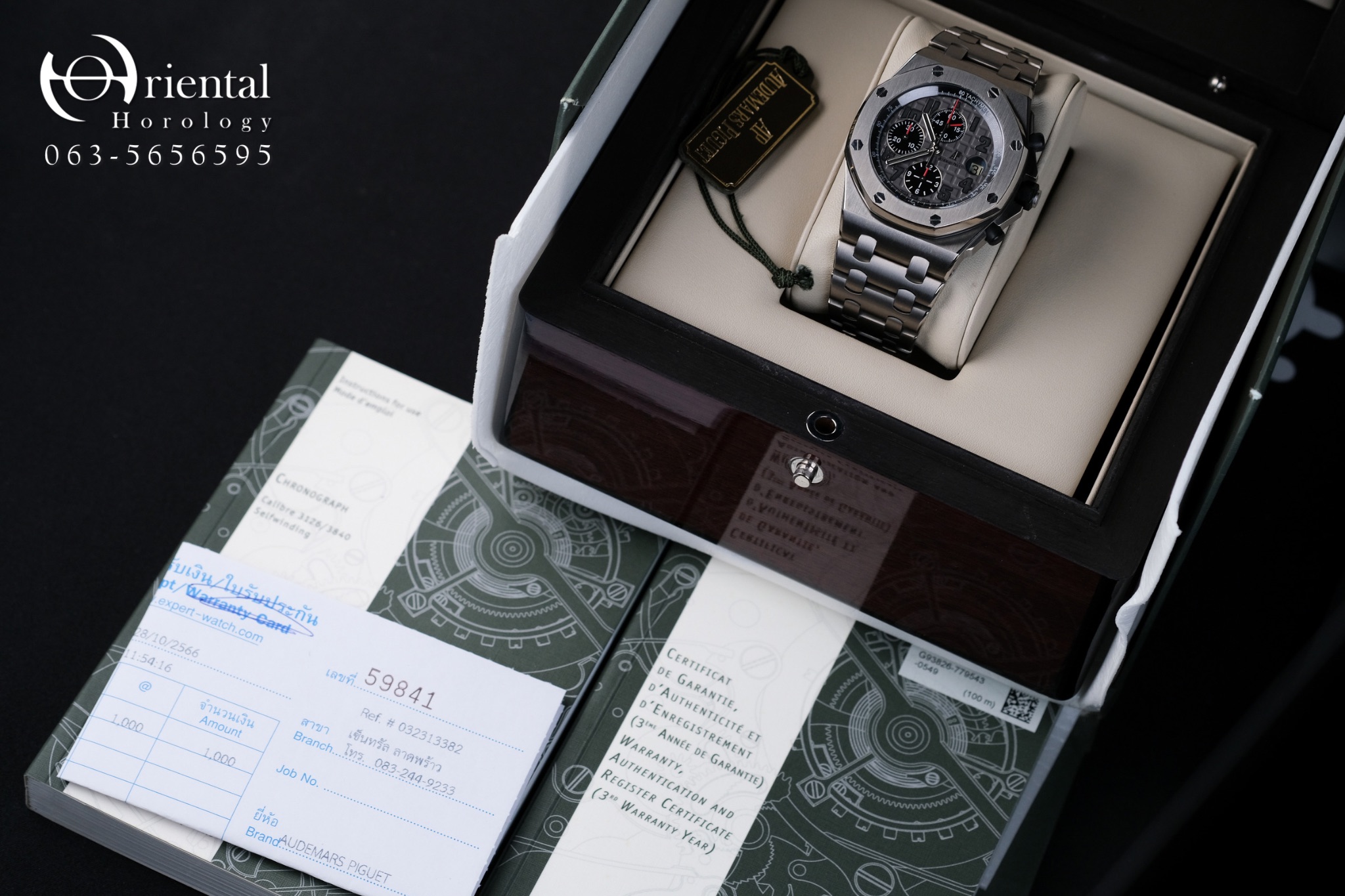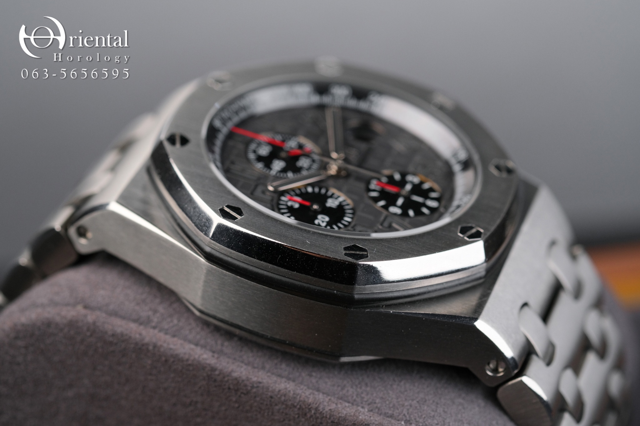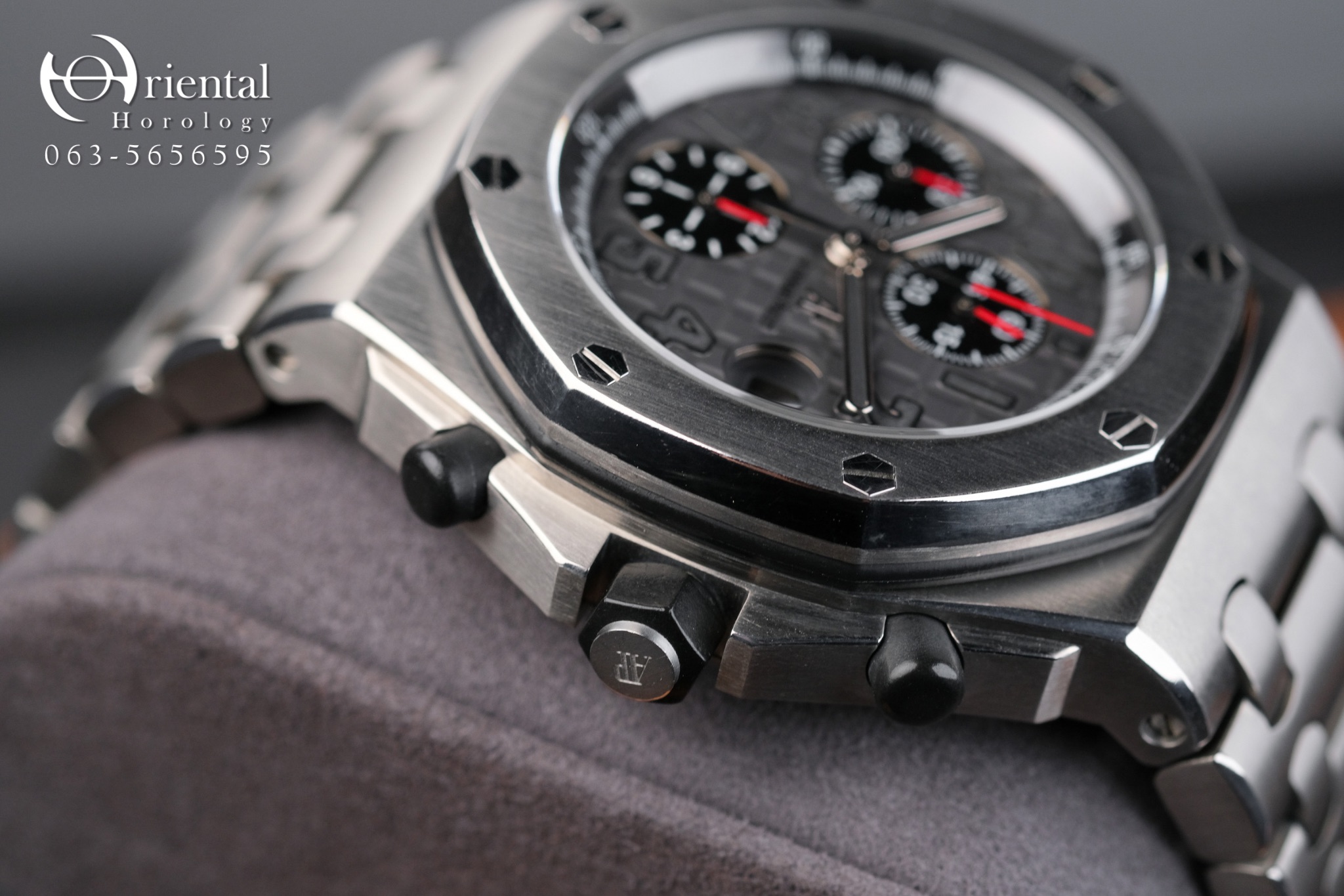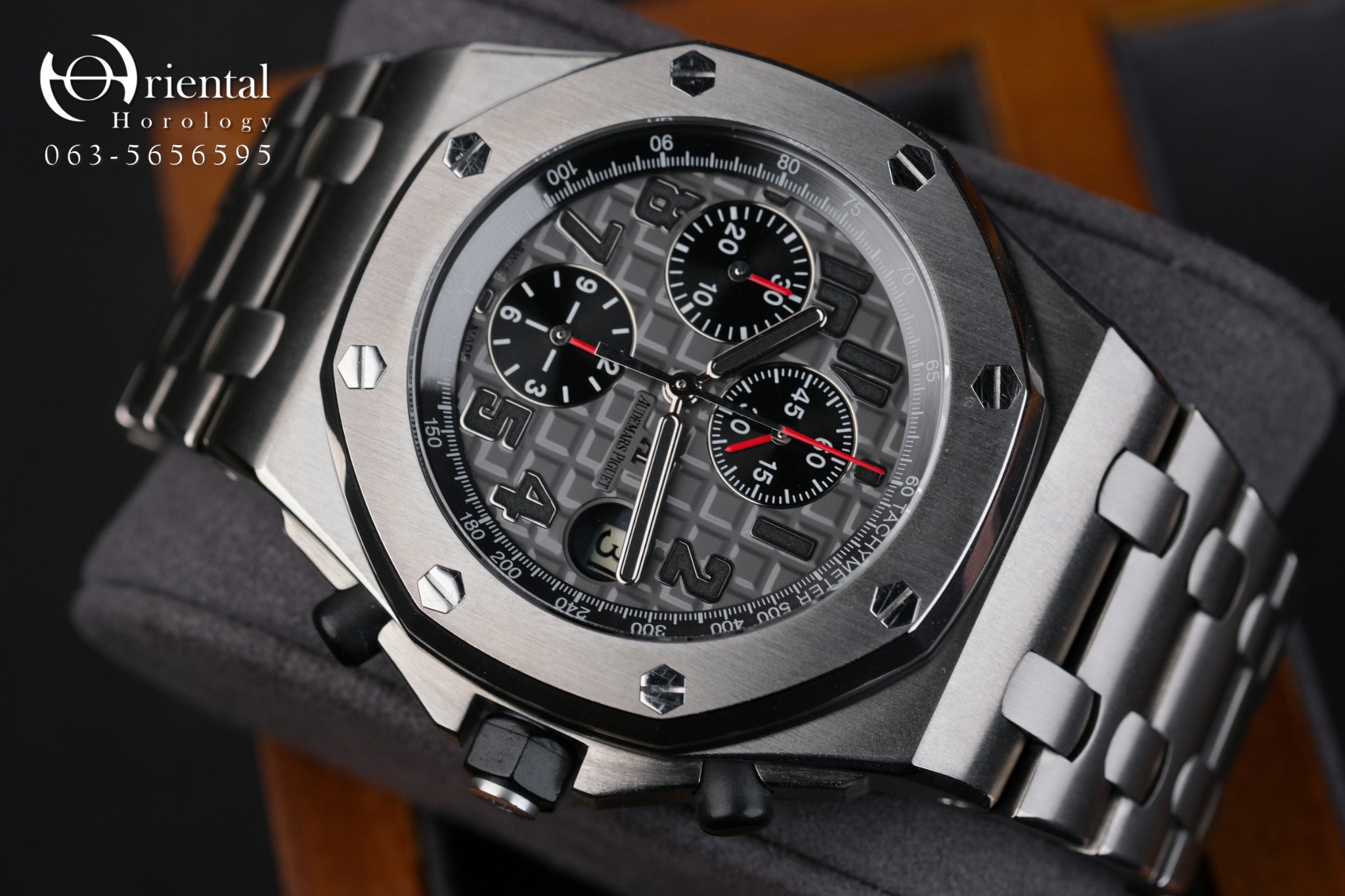 🌟 นาฬิกาทรงสปอร์ตแปดเหลี่ยมยอดนิยมจาก AP ตัวเรือนมาในขนาด 42 มม. วัสดุ Titanium ตัดกับหน้าปัดสีเทาเล่นแสง และวงหน้าปัดย่อยสีดำ คงเอกลักษณ์ด้วยการแกะลายตารางสี่เหลี่ยมตามสไตล์ตระกูล offshore เสริมความสปอร์ตด้วยเม็ดมะยมด้านข้างสีดำ มาพร้อมฟังก์ชัน Chronograph, Date และ Tachymeter สำรองพลังงาน 50 ชั่วโมง กลไก Automatic สวมใส่ง่าย ดูเท่ห์สปอร์ตสุดๆครับผม