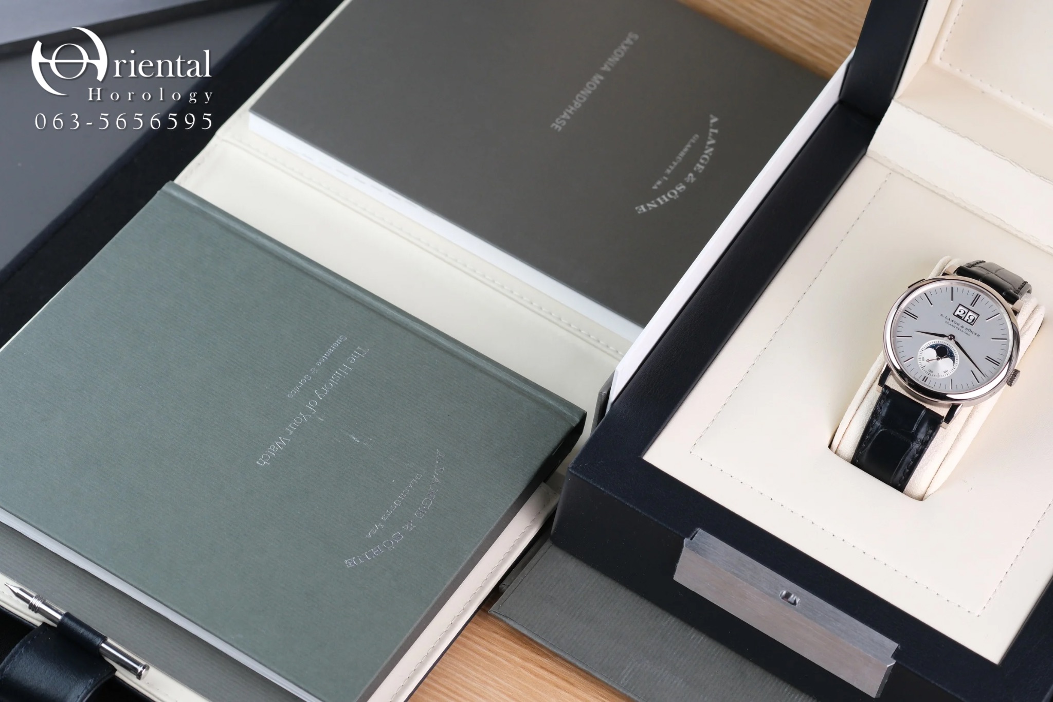 🌟 นาฬิกาหรูสัญชาติเยอรมัน ดีไซน์เรียบง่ายแต่พิถีพิถัน ตัวเรือนทองคำขาว 18K มาในขนาด 40 mm. และหนาเพียง 9.8 มม. เหมาะสมทั้งในลุคทางการและลุคสบายๆ หน้าปัดเงินแท้ (argenté-solid silver) คลาสสิกผสานฟังก์ชัน Outsize Date และ Moon Phase ที่มีความแม่นยำสูง ขับเคลื่อนด้วยกลไกอัตโนมัติ In-House Caliber L086.5 สำรองพลังงานยาวนานถึง 72 ชั่วโมง หลังเปลือยโชว์กลไกตกแต่งประณีต จับคู่มากับสายหนังจระเข้และบัคเคิลทองคำขาว คนที่ชื่นชอบความคลาสสิก เรียบหรู แต่ซ่อนรายละเอียดลึกซึ้งเรือนนี้ห้ามพลาดเลยครับ