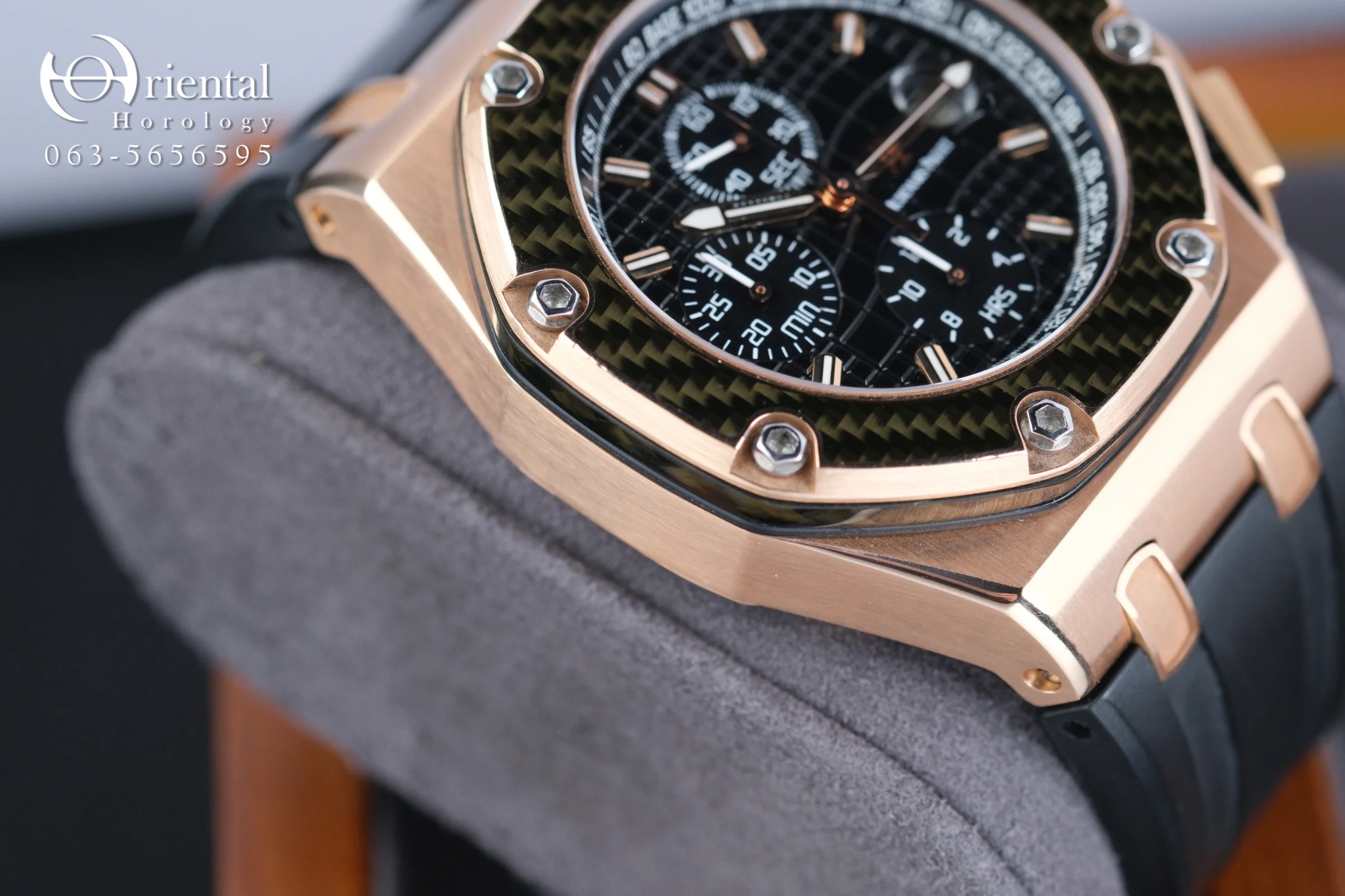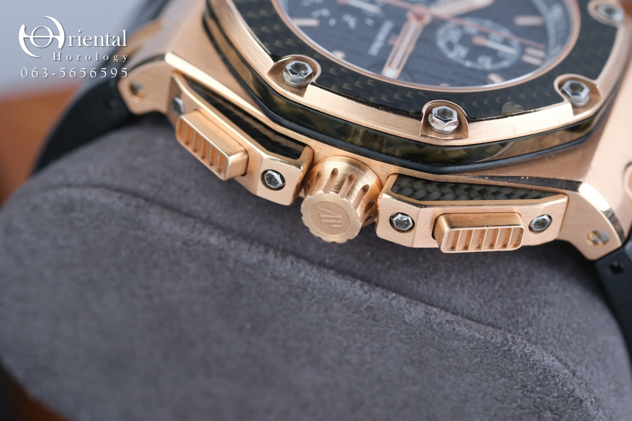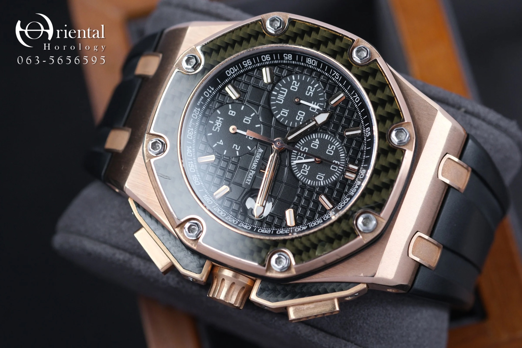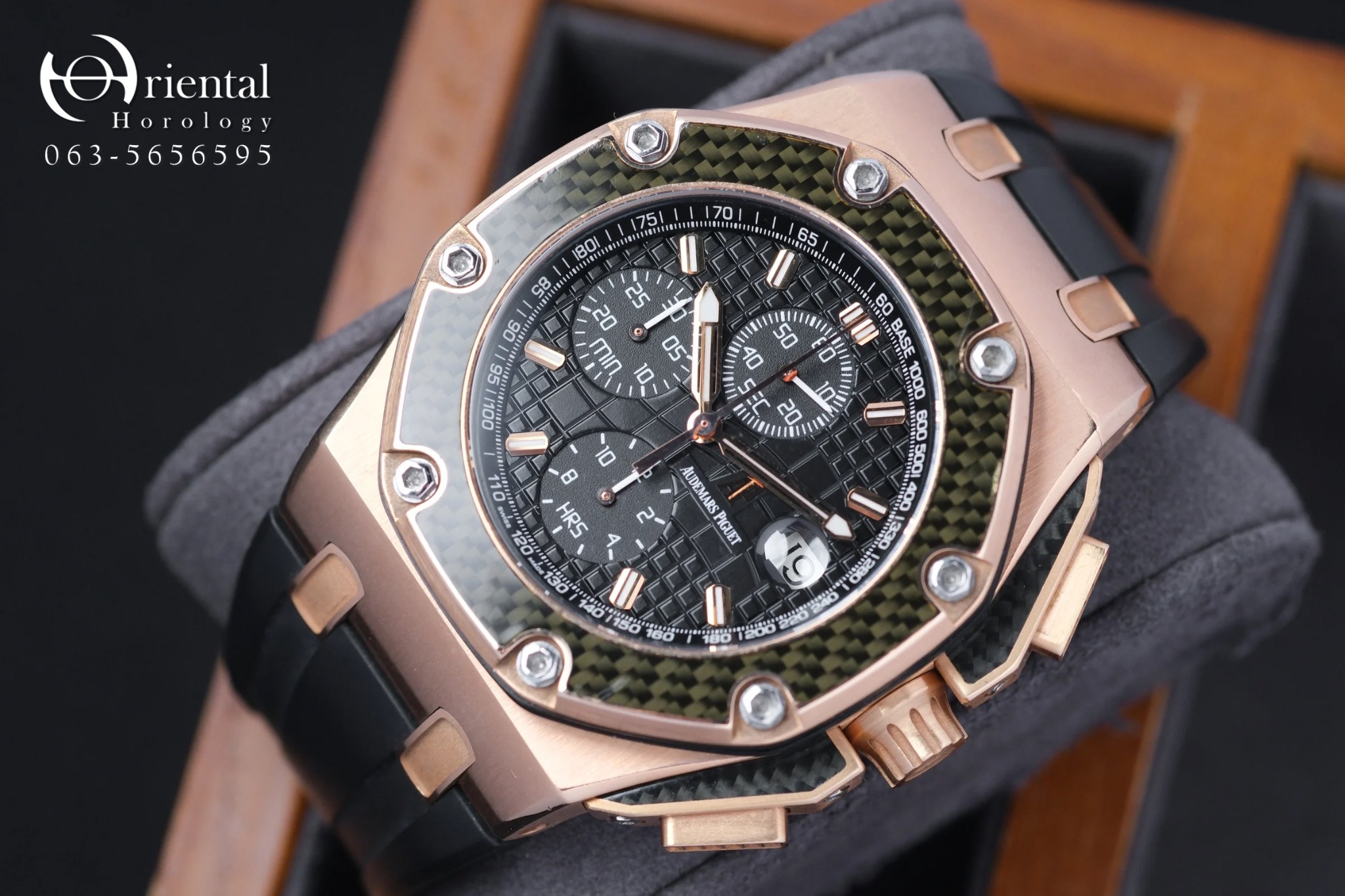 🌟 AP ROO Limited Edition ผลงานการรังสรรค์เพื่อเป็นเกียรติแก่นักแข่งรถชาวโคลอมเบีย “Juan Pablo Montoya” ที่ผลิตเพียง 500 เรือนทั่วโลกเท่านั้น ตัวเรือนมาในขนาด 42 มม. ใส่เท่ห์ไม่ล้นข้อ วัสดุ 18K Rose Gold มาพร้อมสายยางสีดำที่แมทช์กับขอบตัวเรือนคาร์บอน โดดเด่นด้วยหน้าปัดสีดำแกะลายอย่างมีมิติสวยงามและลูกเล่นเข็มบนหน้าปัด Rose Gold ทำให้ดูไม่เรียบจนเกินไป มาพร้อมเคสกับปุ่มกดทรงเหลี่ยม ฟังก์ชัน Chronograph, Date และ กลไก Automatic ฝาหลังเปลือยโชว์เครื่องสวยๆ แต่งตัวง่ายแมทช์ได้กับทุกลุคครับ