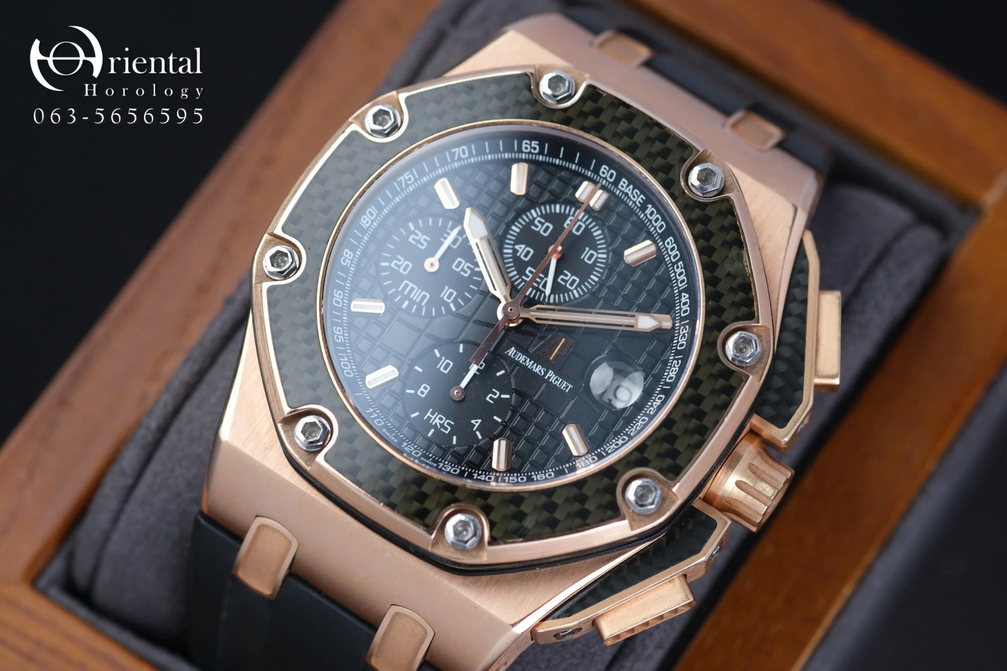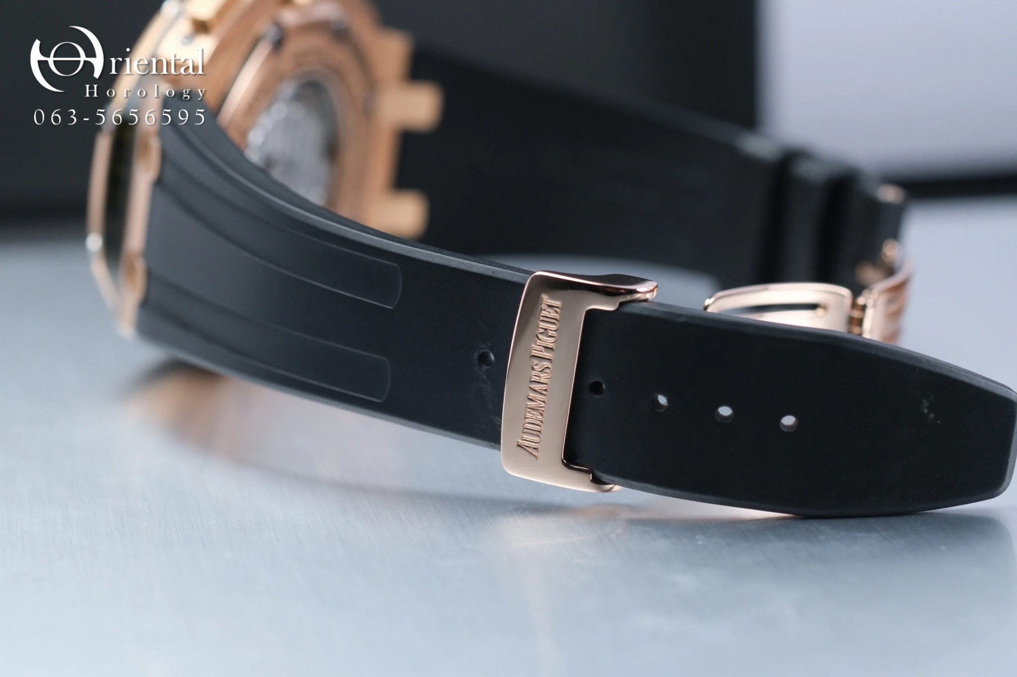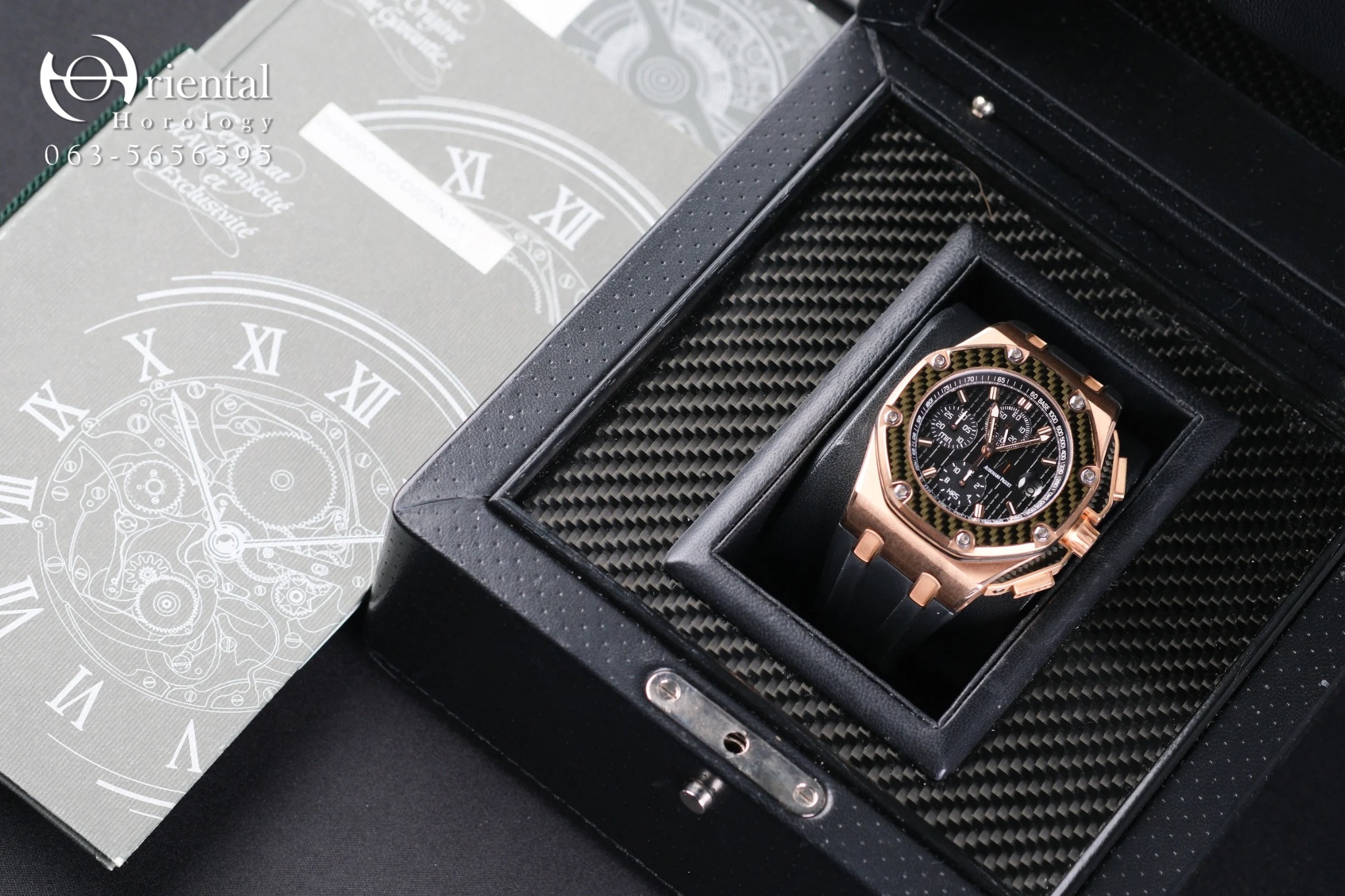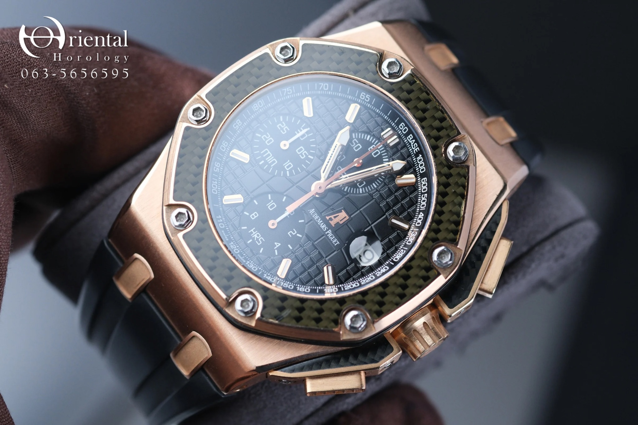 🌟 AP ROO Limited Edition ผลงานการรังสรรค์เพื่อเป็นเกียรติแก่นักแข่งรถชาวโคลอมเบีย “Juan Pablo Montoya” ที่ผลิตเพียง 500 เรือนทั่วโลกเท่านั้น ตัวเรือนมาในขนาด 42 มม. ใส่เท่ห์ไม่ล้นข้อ วัสดุ 18K Rose Gold มาพร้อมสายยางสีดำที่แมทช์กับขอบตัวเรือนคาร์บอน โดดเด่นด้วยหน้าปัดสีดำแกะลายอย่างมีมิติสวยงามและลูกเล่นเข็มบนหน้าปัด Rose Gold ทำให้ดูไม่เรียบจนเกินไป มาพร้อมเคสกับปุ่มกดทรงเหลี่ยม ฟังก์ชัน Chronograph, Date และ กลไก Automatic ฝาหลังเปลือยโชว์เครื่องสวยๆ แต่งตัวง่ายแมทช์ได้กับทุกลุคครับ