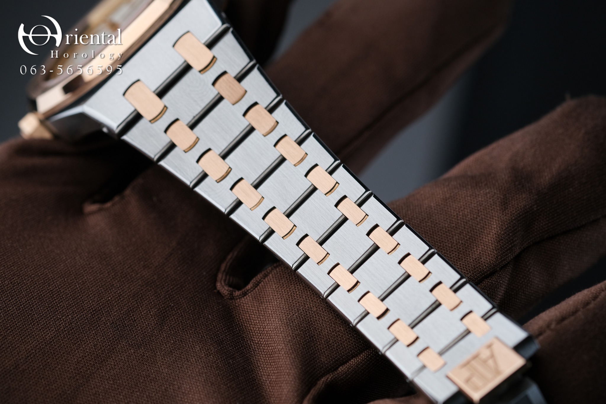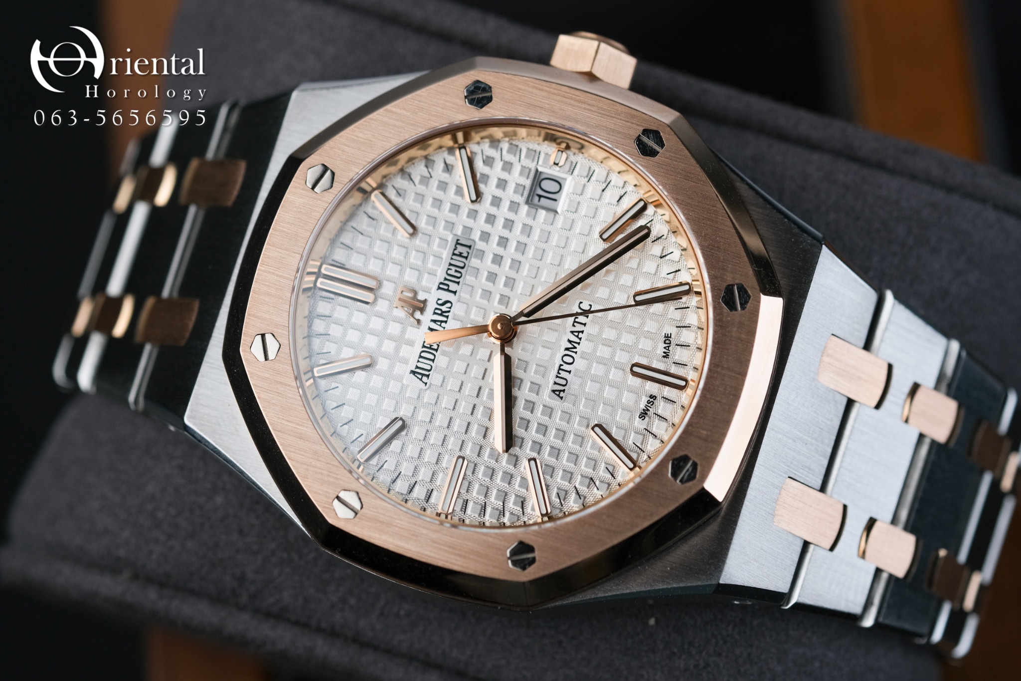 🌟Luxuary Sport สุดหรู ตัวเรือนขนาด 37 มม. วัสดุ 18K Rose Gold & Steel ใส่ขึ้นข้อออร่าจับ เหลี่ยมมุมคมๆ เอกลักษณ์โดนเด่นตามสไตล์ AP ด้วยหน้าปัดแกะลาย Grand Tapisserie สีขาวสะดุดตา มาพร้อมฟังก์ชัน Date กลไก Automatic เปลือยหลังโชว์กลไกสุดแสนประณีตและ Rotor ทองคำตันๆ สลักโลโก้แบรนด์ AP สวยงามครับ
