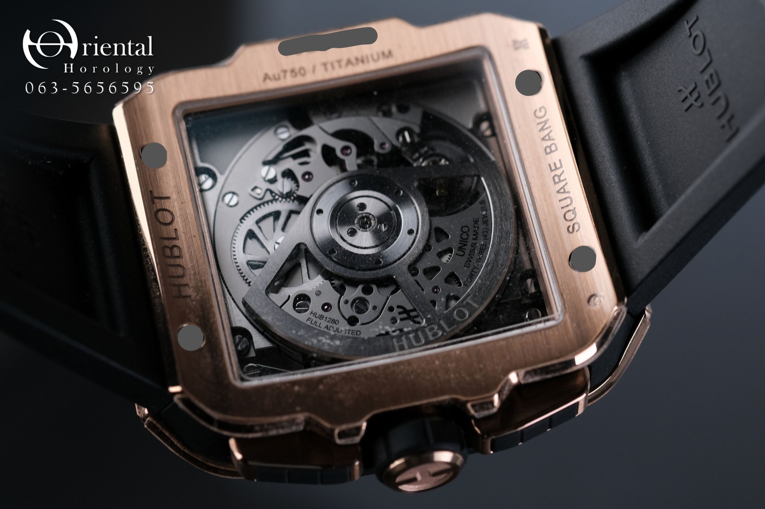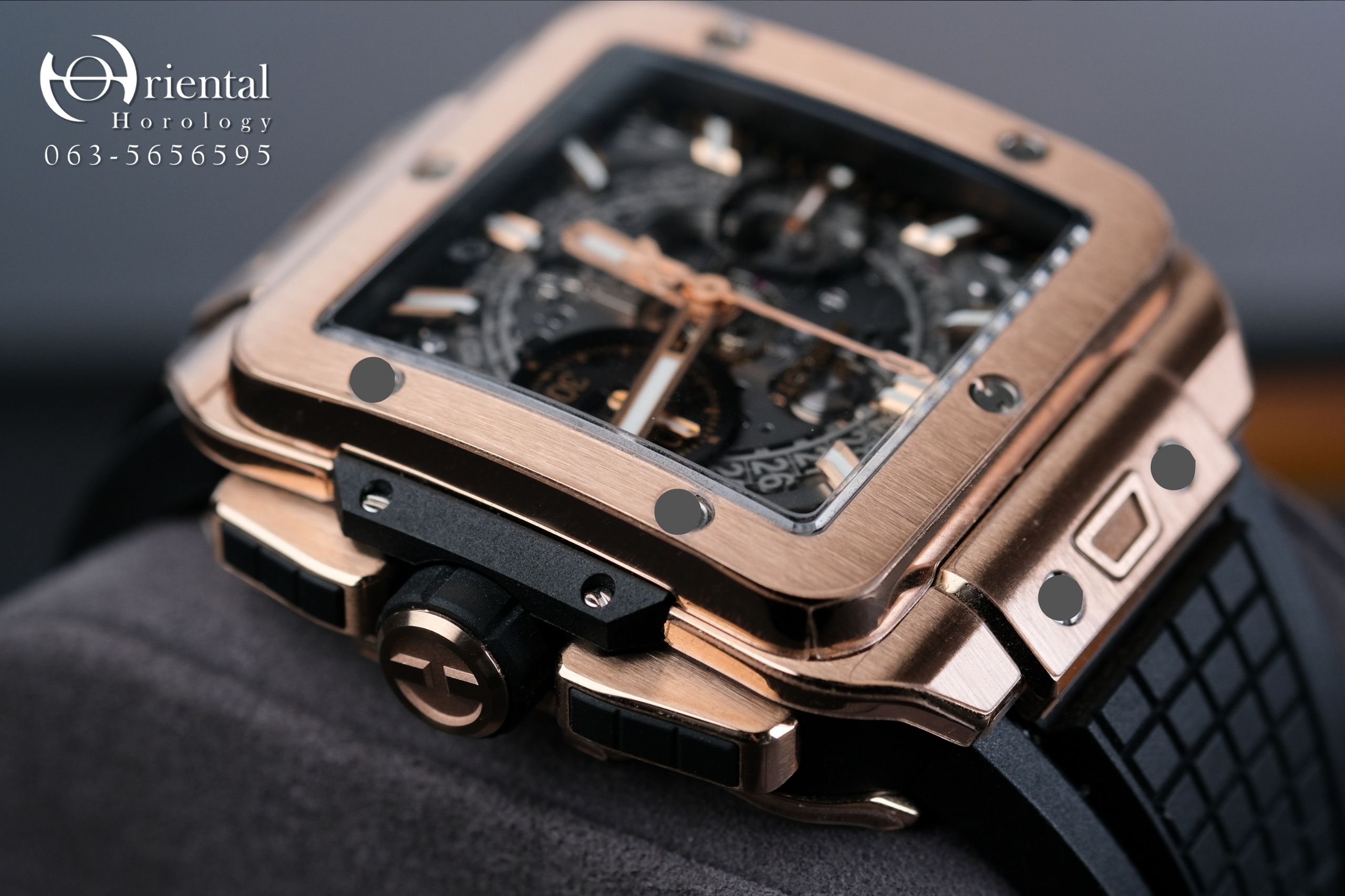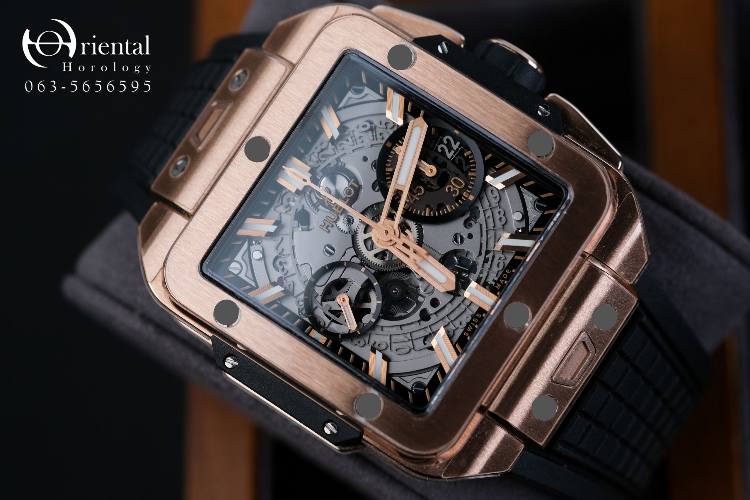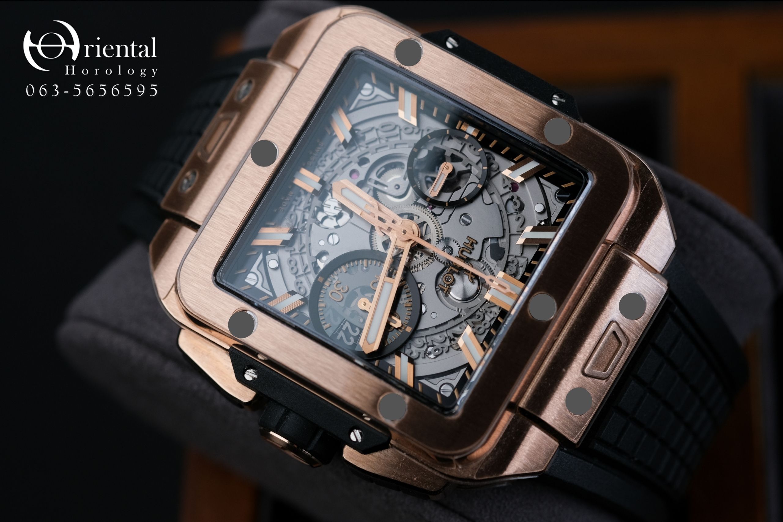 🌟 🌟 ความท้าทายของการดีไซน์สุดเท่ห์จาก Hublot ตัวเรือนมาในขนาด 42 mm รุ่นนี้มาพร้อม ears ทั้งสองด้านที่ออกแบบมาให้ดูสมดุลย์และปกป้องตัวเรือนไปในขณะเดียวกัน มีการผสมผสานความหรูหราจากวัสดุ King Gold 18k ที่เป็นสีทองเอกลักษณ์เฉพาะตัวของ Hublot ทั้งตัวเรือน พร้อมมีการขัดพื้นผิวซาตินและขัดเงา หน้าปัดทรงสี่เหลี่ยมจัตุรัสเปลือยโชว์โครงสร้างกลไกอย่างสวยงาม เข็มและหลักเวลาสี King Gold มาพร้อมฟังก์ชัน Flyback Chronograph และ Power Reserve 72 ชม. สาย One click ถอดเปลี่ยนง่าย และสายยางลาย chocolate squares ที่เป็นเอกลักษณ์เฉพาะของรุ่นนี้ จัดว่าเป็นการดีไซน์ที่ลงตัวและแมทช์กับชุดง่ายสุดๆครับ