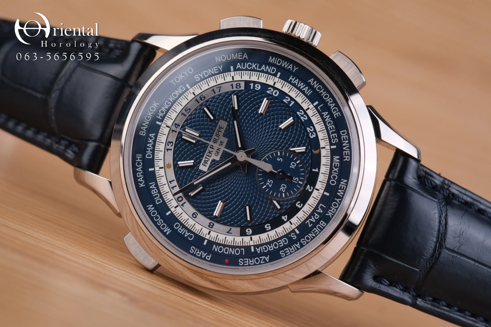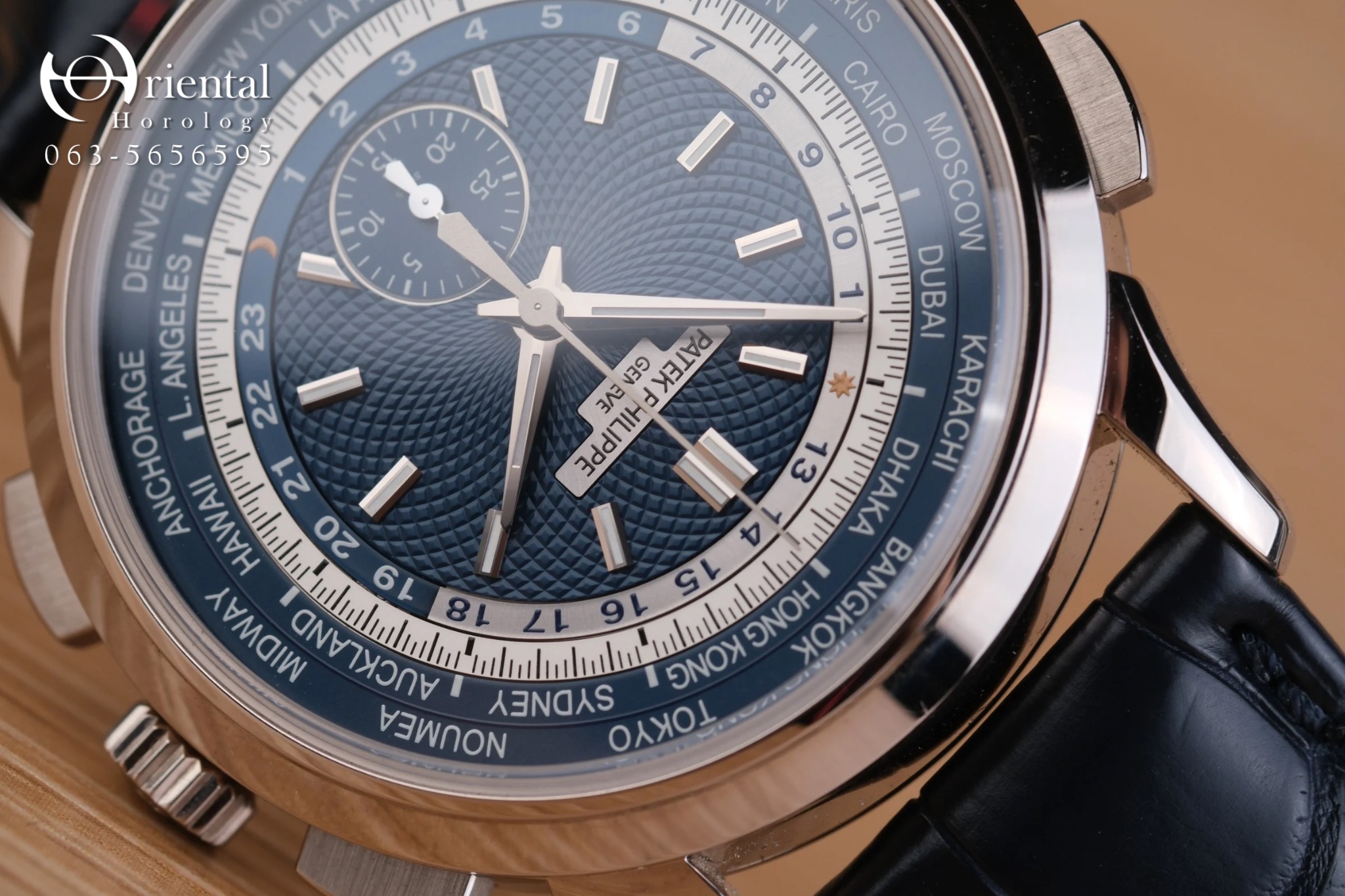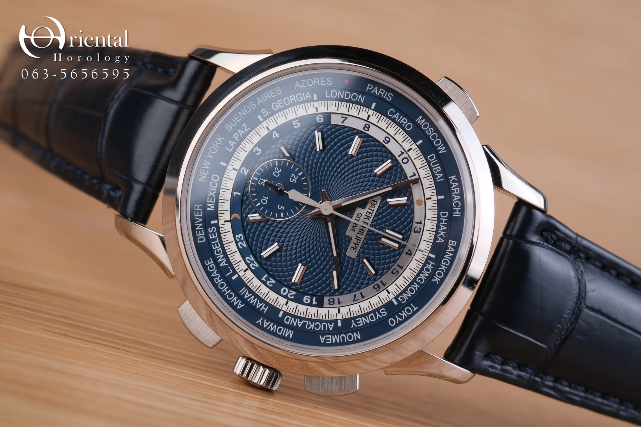 🌟 ตัวเรือน 18K White Gold ขนาด 39.5 mm. มาพร้อมหน้าปัดสุดเอกลักษณ์กับวงแหวนแสดงชื่อเมืองทั้ง 24 เมือง และพื้นลายเส้นสาน เป็นการนำแบบลวดลายมาจากหน้าปัดนาฬิกาที่เก็บรักษาไว้ในพิพิธภัณฑ์ของ Patek Philippe มาพร้อมกลไก Automatic สำรองพลังงาน 55 ชม. ฟังก์ชัน World Time แสดงเวลา 24 ไทม์โซน และ Chronograph flyback หลังเปลือยโชว์ความงดงามของกลไก จับคู่มากับสายหนังจระเข้สีน้ำเงิน ให้ลุคเรียบหรู ดูหล่อสุดๆครับ